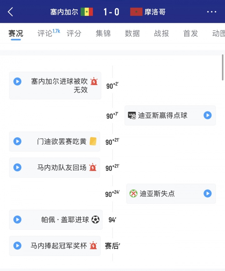 直播吧01月19日讯 2025非洲杯决赛上演神奇剧情,塞内加尔绝杀球被吹,随后被判点球,无法接受的塞内加尔球员准备罢赛最终被马内劝了回来。然而得到点球的东道主摩洛哥却由头号球星迪亚斯罚失点球,比赛进入加时赛。加时赛中塞内加尔破门,最终他们起死回生1-0力克东道主夺冠。