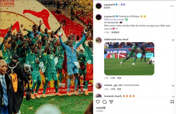 帕佩·盖耶也在赛后通过社媒晒出全队捧杯照,并配文:“非洲冠军⭐️⭐️#任务完成✅感谢真主🤲🏿感谢大家的支持,迫不及待想回国和你们一起庆祝❤️!!!”