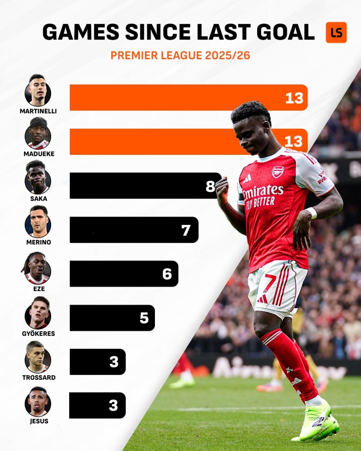 直播吧01月19日讯 尽管阿森纳目前在英超以7分优势领跑,但根据LiveScore统计,阿森纳队内一众攻击手已经遭遇至少3轮的联赛球荒,多的甚至有13轮。