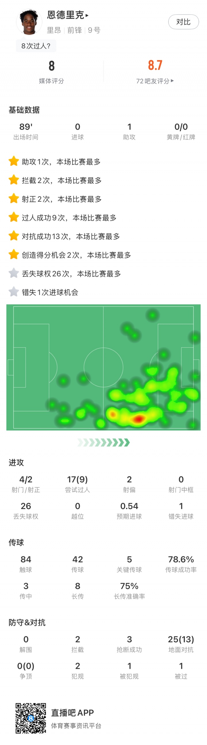 在里昂2-1布雷斯特的比赛中,恩德里克9次成功过人冠绝全场,并且还贡献1次助攻,获评8分队内最佳。