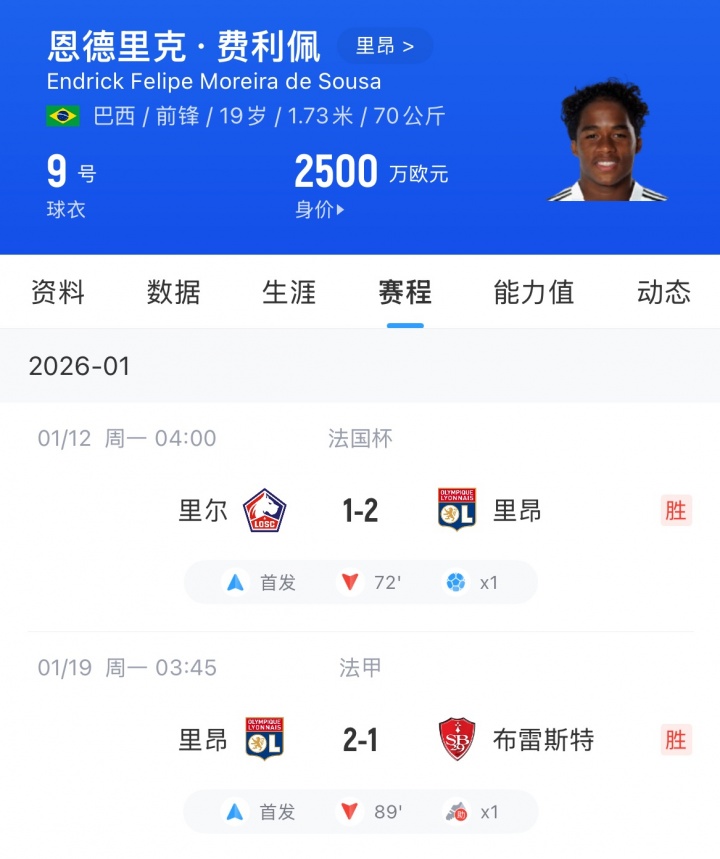 恩德里克从皇马租借至里昂以来,出战了1场法国杯和1场法甲,两场比赛他都有参与进球,表现出色。
