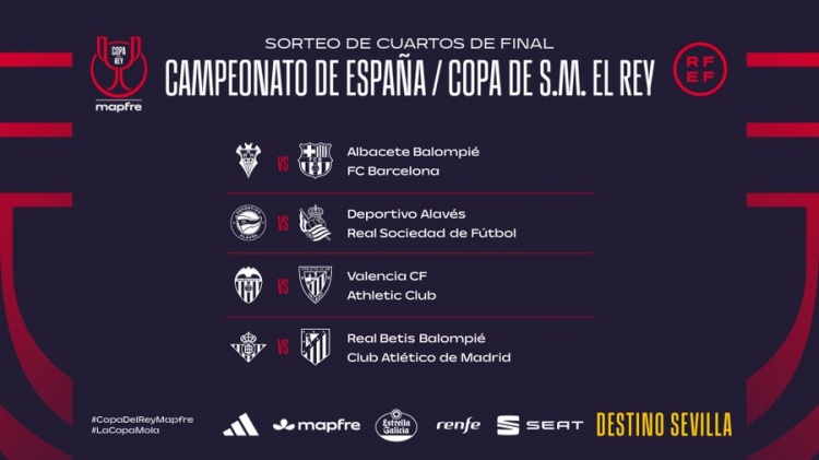 直播吧1月19日讯 本赛季国王杯1/4决赛抽签结果出炉,阿尔瓦塞特对阵巴萨,贝蒂斯对阵马竞。