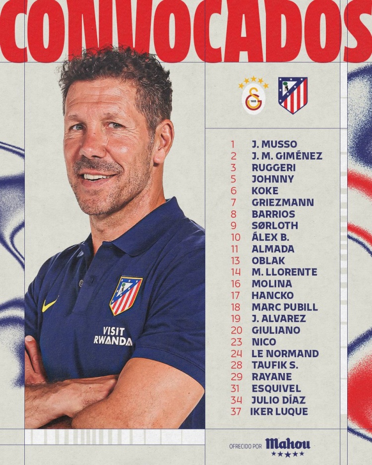 1-穆索、2-吉梅内斯、3-鲁杰里、5-乔尼、6-科克、7-格列兹曼、8-巴里奥斯、9-瑟尔洛特、10-巴埃纳、11-阿尔马达、13-奥布拉克、14-马科斯·略伦特、16-莫利纳、17-汉茨科、18-普比尔、19-阿尔瓦雷斯、20-朱利亚诺·西蒙尼、23-尼科、24-勒诺尔芒、28-陶菲克·塞义杜、29-拉亚内·贝莱德、31-埃斯奎维尔、34-胡里奥·迪亚斯、37-伊克尔·卢克
