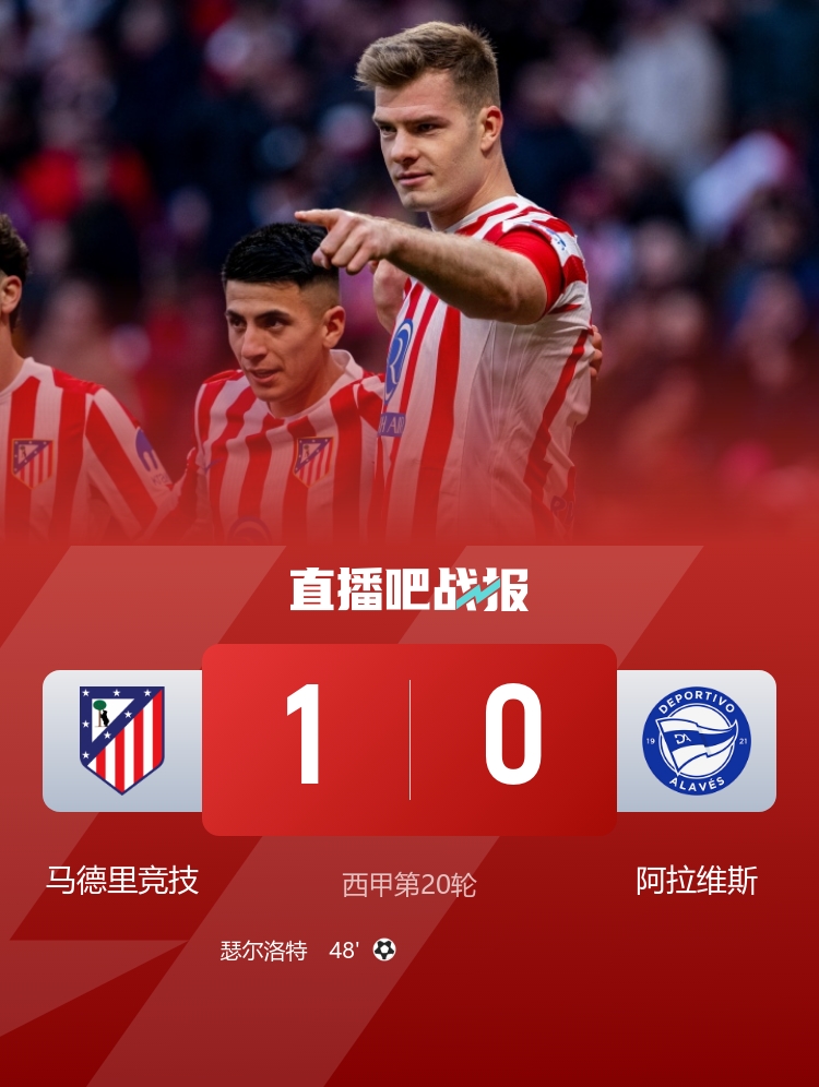 直播吧1月19日讯 北京时间1月18日23点15分,西甲第20轮,马德里竞技在主场利雅得航空大都会球场迎战阿拉维斯。上半场,西蒙尼头顶脚踢多次威胁球门,帕拉达门线前救险。下半场,瑟尔洛特头球破门,巴埃纳兜射中柱。最终马德里竞技1-0阿拉维斯。本场比赛过后,马德里竞技先赛情况下积41分,仍旧排在联赛第四,阿拉维斯积19分排在联赛倒数第三。
