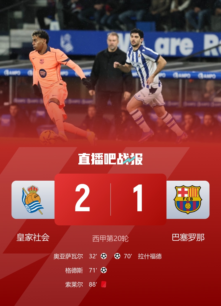直播吧1月19日讯 西甲第20轮,皇家社会坐镇主场阿诺埃塔体育场迎战巴塞罗那。上半场,奥亚萨瓦尔被吹后再次进球,巴萨费尔明、德容、亚马尔三球被吹,亚马尔点球也被取消。易边再战,奥尔莫、孔德中柱,拉什福德破门,格德斯建功,久保建英伤退,索莱尔飞铲佩德里直红。最终皇家社会2-1巴萨。积分榜方面,巴萨49分仅1分领跑,皇社24分第八。