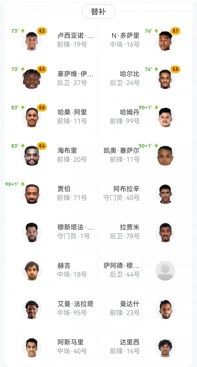 第49分钟,新月获得前场右路角球机会,鲁本·内维斯主罚开到禁区,坦巴蒂抢点头槌破门!新月1-1扳平↓