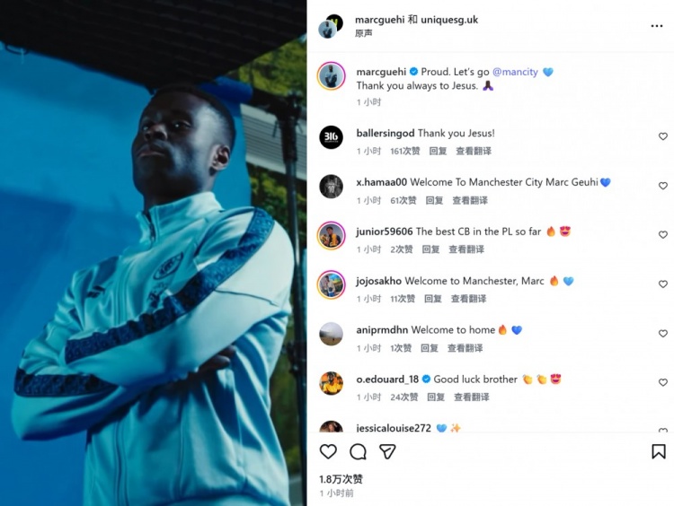 他随后晒出自己加盟曼城的定妆照,并配文:“自豪!让我们出发吧@曼城。永远感谢耶稣。🙏🏿”