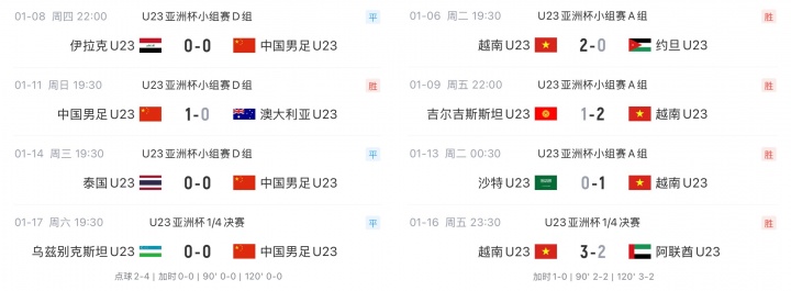 越南U23战绩:2-0约旦U23、2-1吉尔吉斯斯坦U23、1-0沙特U23,3战全胜积9分小组第一出线,1/4决赛加时3-2淘汰阿联酋U23。