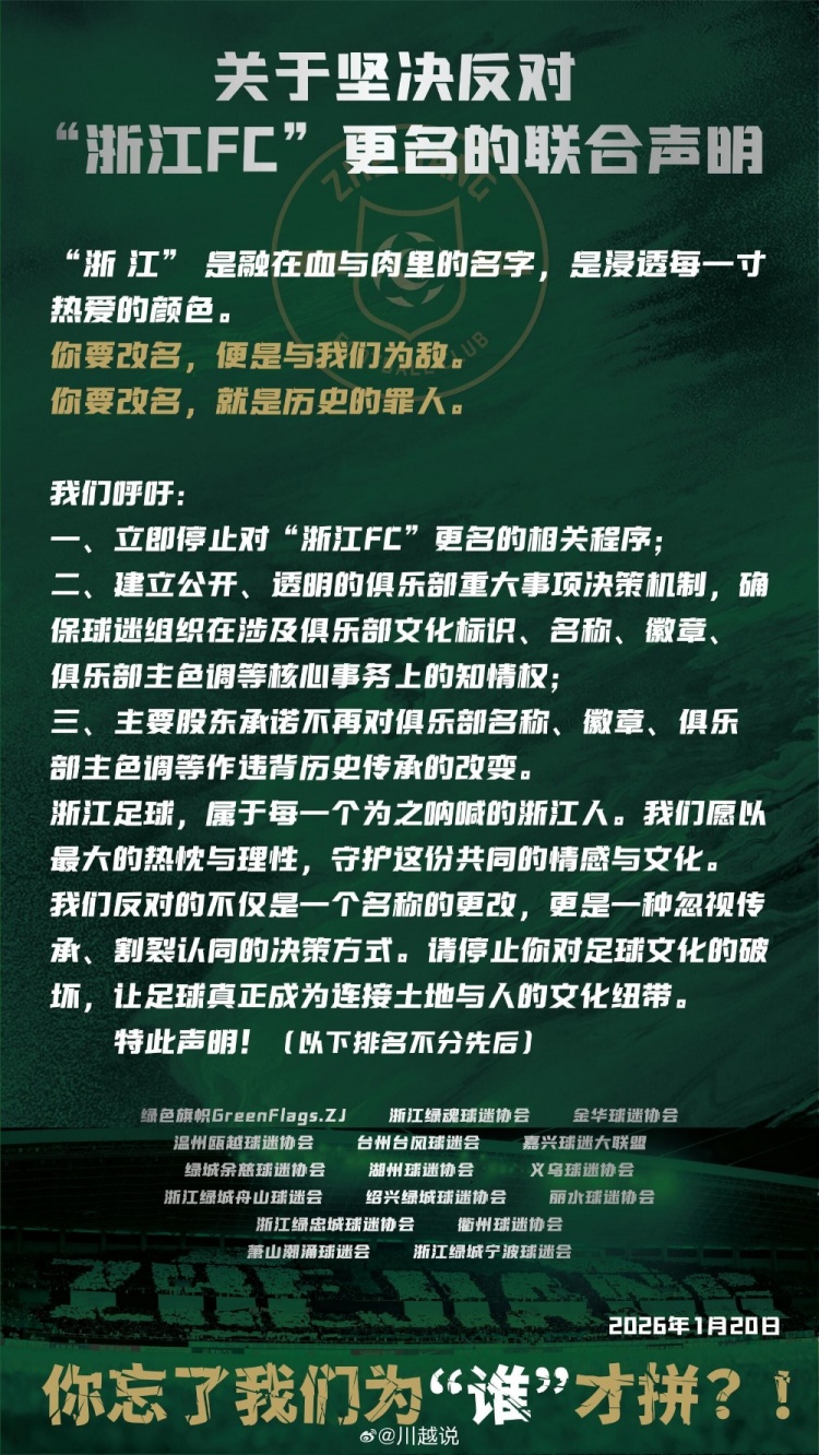我们反对的不仅是一个名称的更改,更是一种忽视传统、割裂认同的决策方式。请停止你对足球文化的破坏,让足球真正成为连接土地与人的文化纽带。