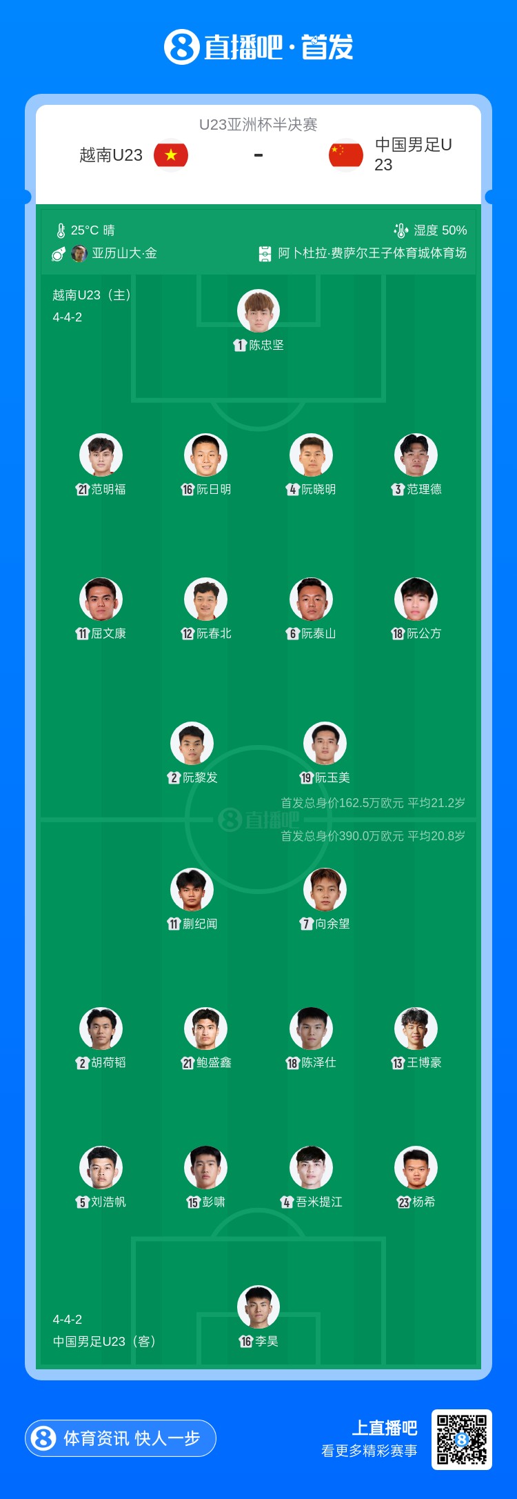 直播吧01月20日讯 北京时间23点30分,U23亚洲杯半决赛,中国男足U23vs越南U23,赛前双方首发公布!【本场比赛U23国足首发较上场有6处变动,前场5人全部更换,李昊继续先发,蒯纪闻、向余望、刘浩帆先发出战,王钰栋、拜合拉木、徐彬替补】