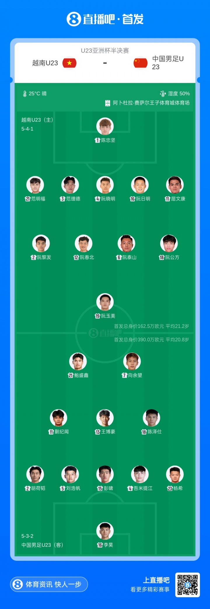 国足U23首发身价390万欧,越南队首发身价162.5万欧;国足U23首发平均年龄20.8岁,越南队首发平均年龄21.2岁。