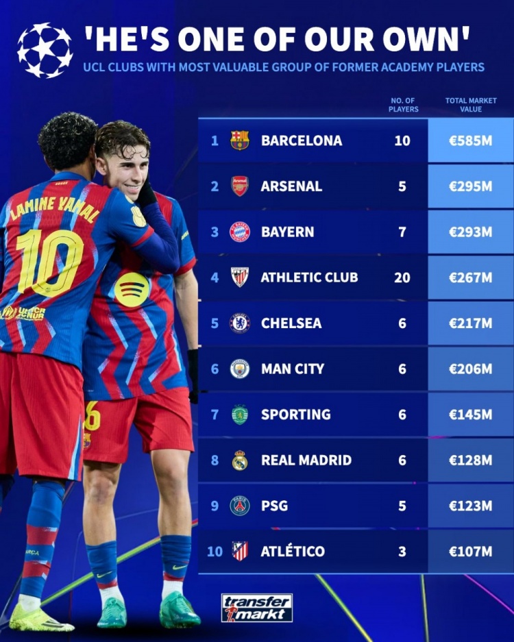 直播吧1月20日讯 德国转会市场统计了欧冠俱乐部之中自家青训球员的身价,并列出榜单,巴萨居首,阿森纳、拜仁前三。