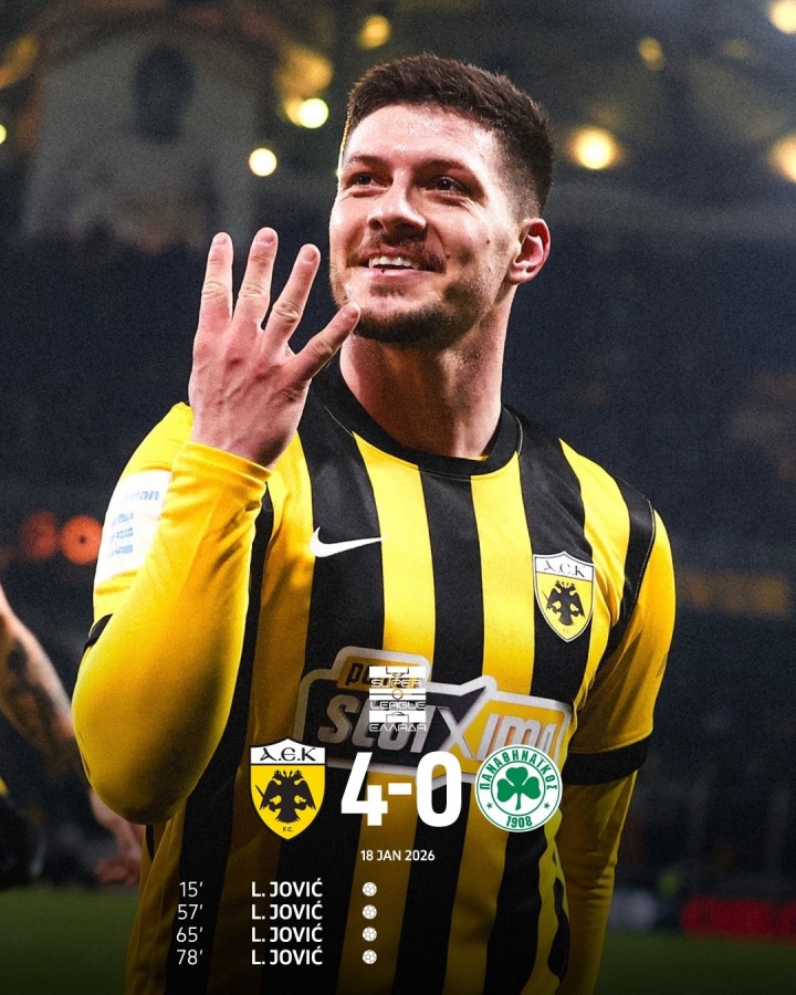 直播吧01月20日讯 希腊超级联赛第17轮,雅典AEK4-0大胜帕纳辛奈科斯,赢得雅典德比。约维奇此役首发出战84分钟,在第15到78分钟连进四球,上演大四喜。