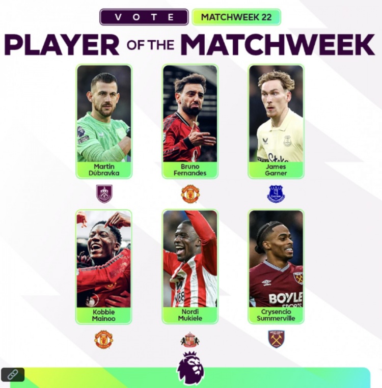 直播吧1月20日讯 英超官方公布第22轮最佳球员候选,梅努携手B费等6人入围。