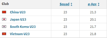 附U23亚洲杯各队平均年龄: