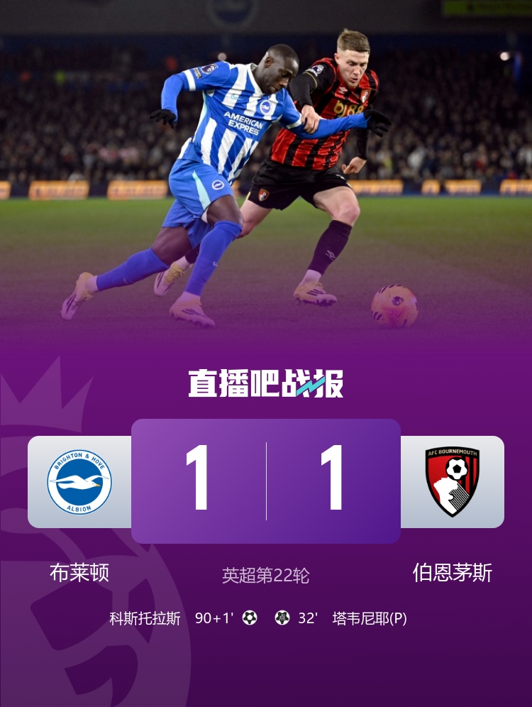 直播吧1月20日讯 英超第22轮,布莱顿坐镇主场美国运通社区球场迎战伯恩茅斯。上半场,阿德利造点塔韦尼耶点射建功,埃瓦尼尔森中柱+屡造险。易边再战,明特造险,科斯托拉斯补时倒钩破门。最终布莱顿1-1伯恩茅斯。积分榜方面,布莱顿30分第十二,伯恩茅斯27分第十五。