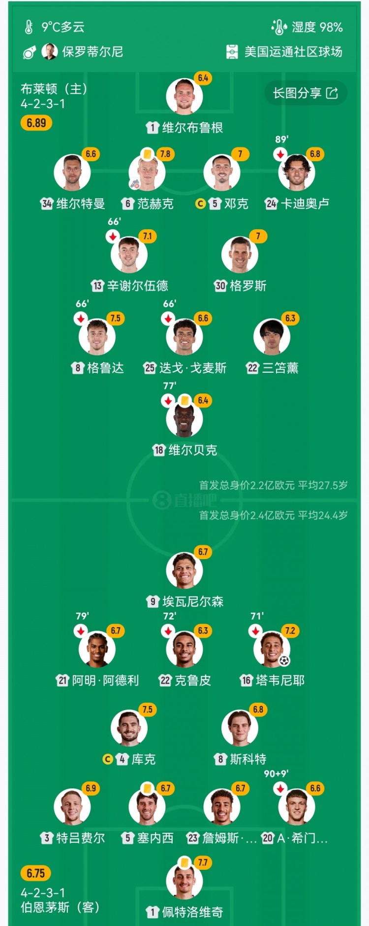 第85分钟,布莱顿右路传中到禁区,门前范赫克乱战中的机会打偏错失良机↓