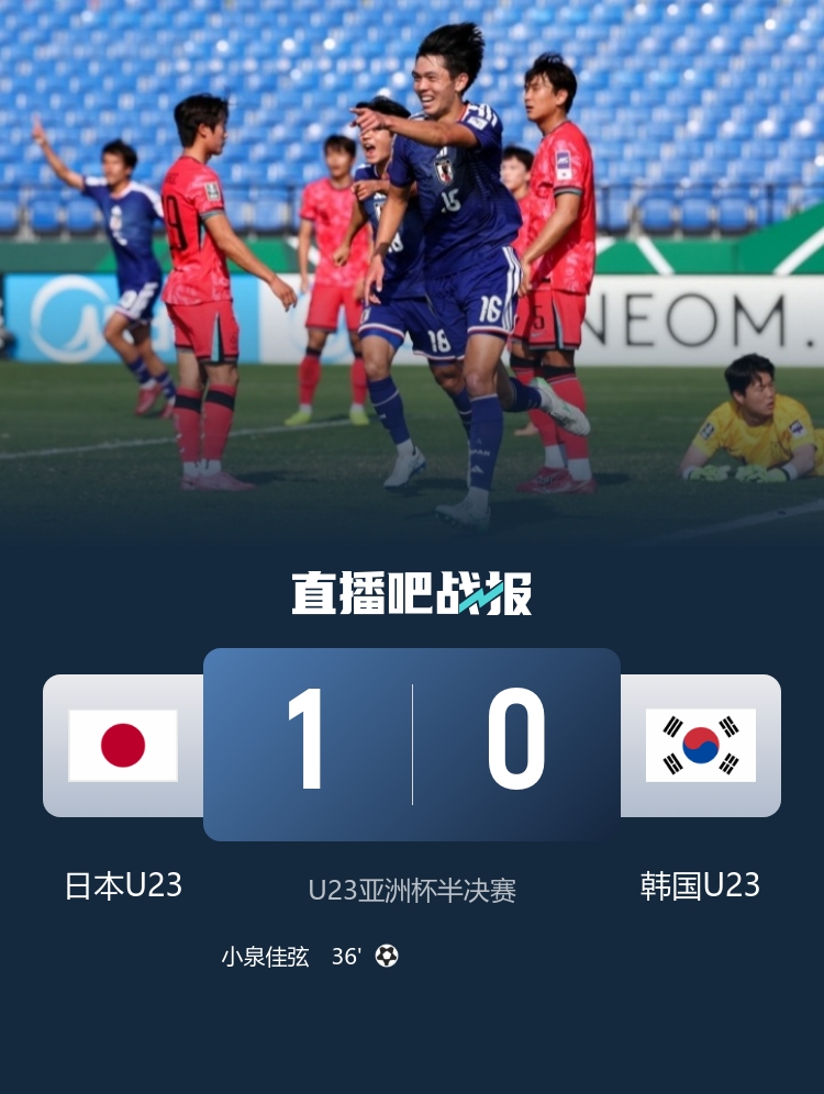 直播吧1月20日讯 北京时间1月20日19:30,U23亚洲杯半决赛日本U23迎战韩国U23的比赛在阿卜杜拉国王体育场进行,上半场道协丰两失单刀,荒木琉伟献精彩扑救,小泉佳弦补射破门首开记录,半场结束,U23日本1-0韩国U23。下半场张硕桓远射中楣,最终U23日本1-0韩国U23连续两届进决赛,决赛对手将是U23中国与U23越南之间的胜者。