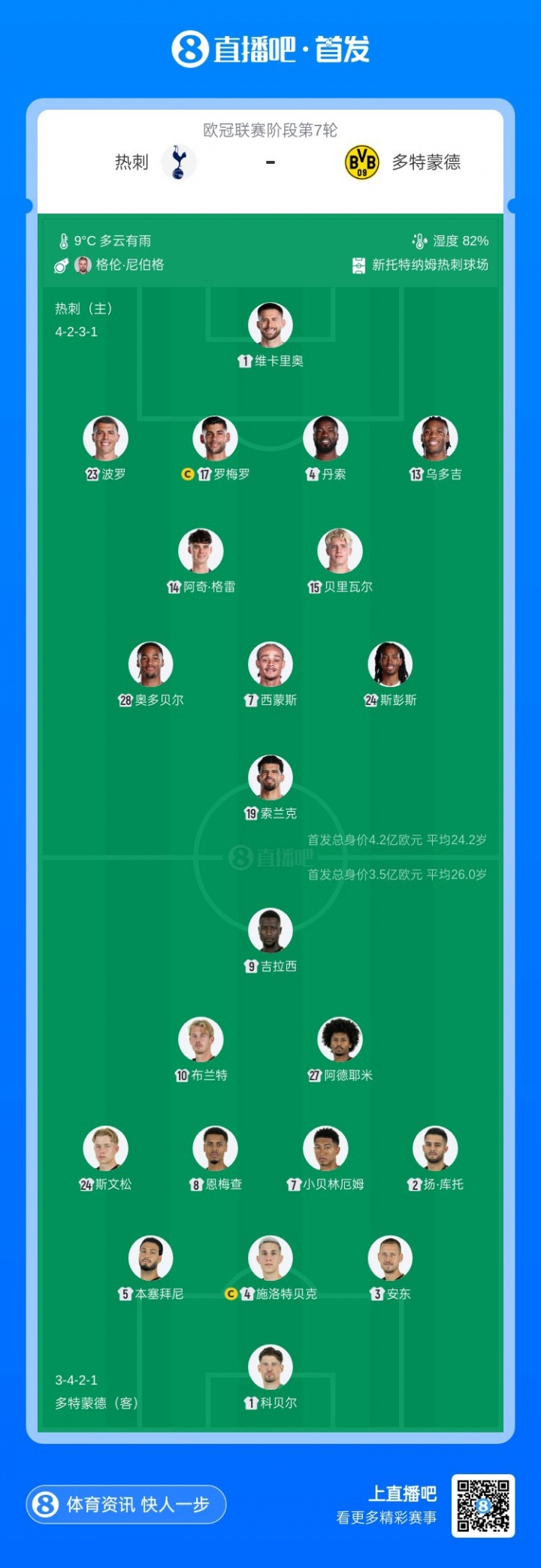 多特首发:1-科贝尔、2-扬·库托、3-安东、4-施洛特贝克、5-本塞拜尼、24-斯文松、7-小贝林厄姆、8-恩梅查、10-布兰特、9-吉拉西、27-阿德耶米