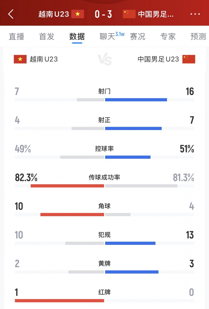 控球率:U23国足51%,U23越南49%