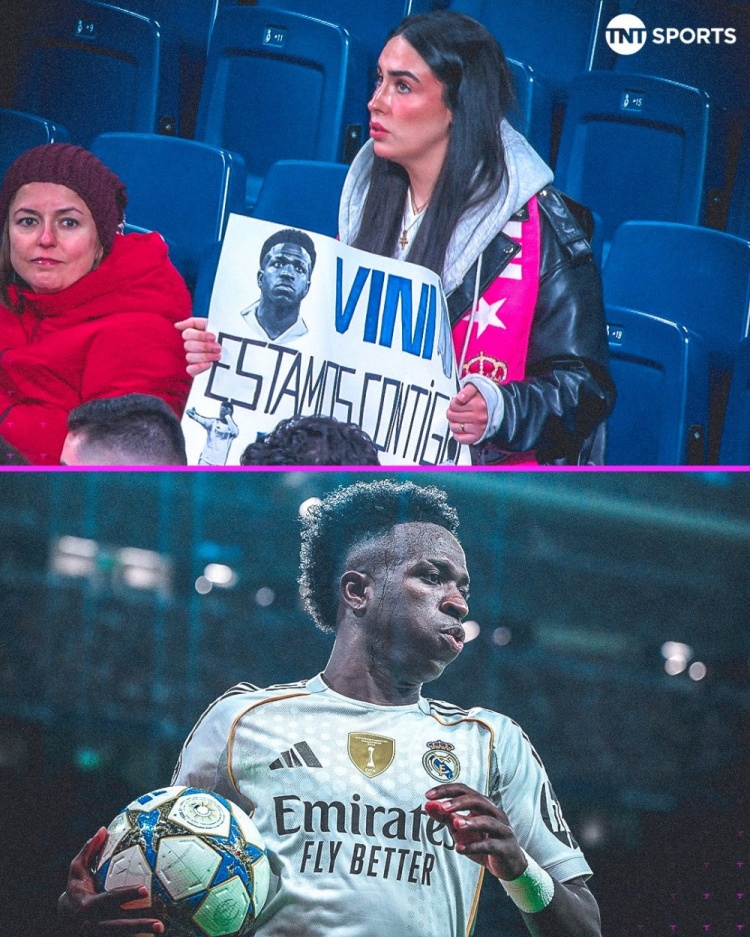 据TNT报道,一位球迷在伯纳乌球场举起支持维尼修斯的标语牌,上面写着“维尼修斯,我们与你同在”,表达对这位皇马前锋的支持,此前的比赛中,维尼修斯曾遭到皇马球迷的嘘声对待。
