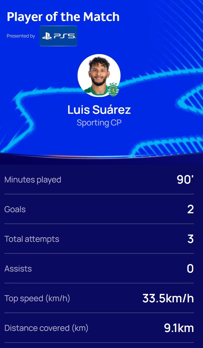 此役路易斯·苏亚雷斯为葡萄牙体育梅开二度,他当选本场比赛全场最佳球员。