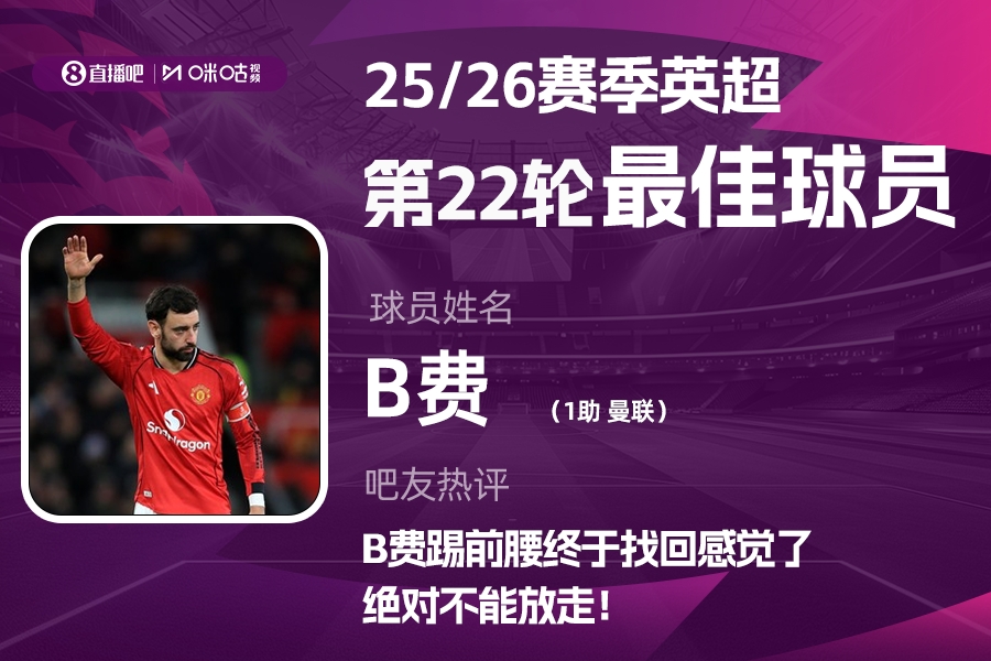 2025-2026赛季英超火热进行中,直播吧和咪咕体育联合发起每轮英超最佳球员评选活动!第22轮评选结果已经出炉,曼联队长B费送出助攻帮助球队击退曼城,赢下曼市德比,成功当选本轮英超最佳。