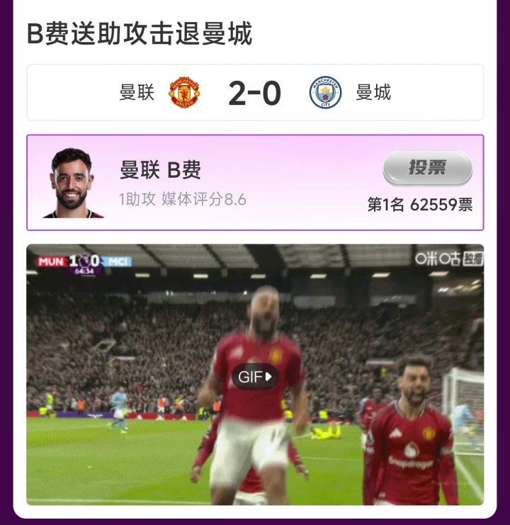 本轮联赛曼联2-0击败曼城,展现了酣畅淋漓的红魔反击艺术。B费送出助攻的同时评分也是全场最高分,最终他得到超6万张投票,当选【直播吧X咪咕体育英超第22轮最佳球员】。