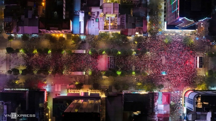 越南媒体拍摄的越南球迷在胡志明市阮惠街聚集观赛图