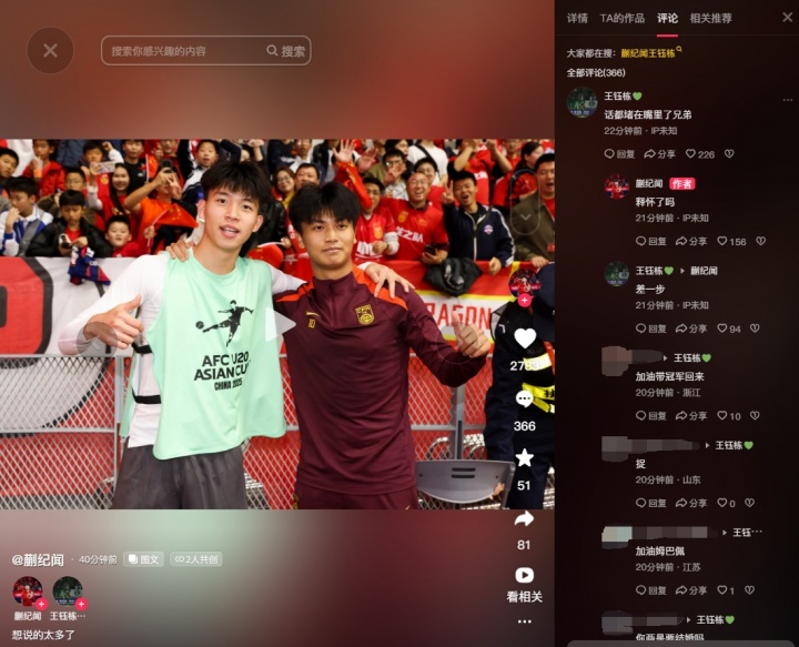 今天下午,蒯纪闻和王钰栋更新社媒晒出两张合照,一张是去年U20亚洲杯,一张是今年U23亚洲杯,两人在评论区互动。