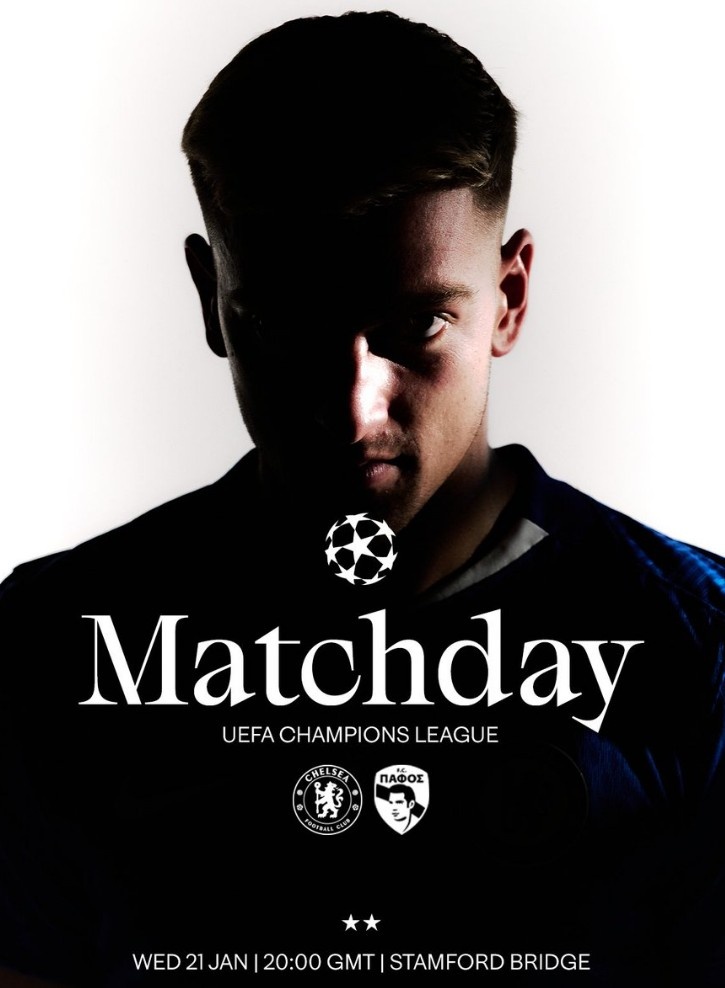 直播吧1月21日讯 本轮欧冠切尔西将在主场迎战帕福斯,球队官推也晒出海报为本场比赛预热。