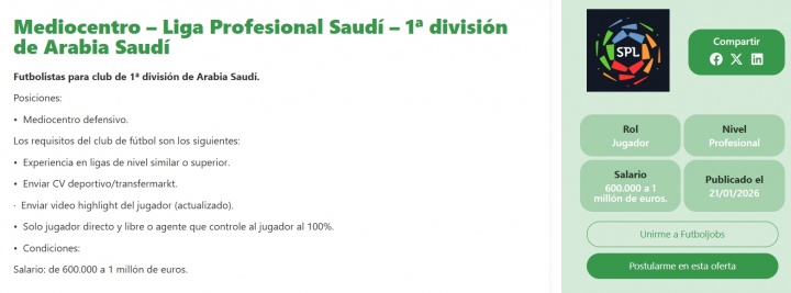 直播吧01月21日讯 在足球行业招聘网站futboljobs上,一支沙特甲级联赛(二级联赛)球队发布了一则招聘启事,招聘中场球员,年薪60万到100万欧元。