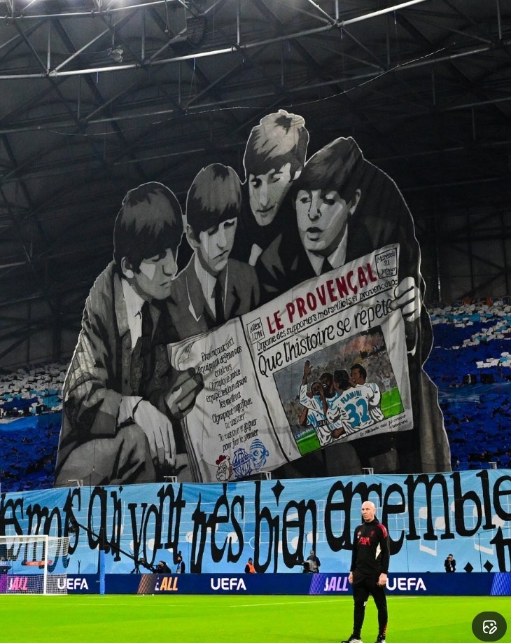 迎战利物浦,马赛主场球迷展示出披头士主题巨幅TIFO
