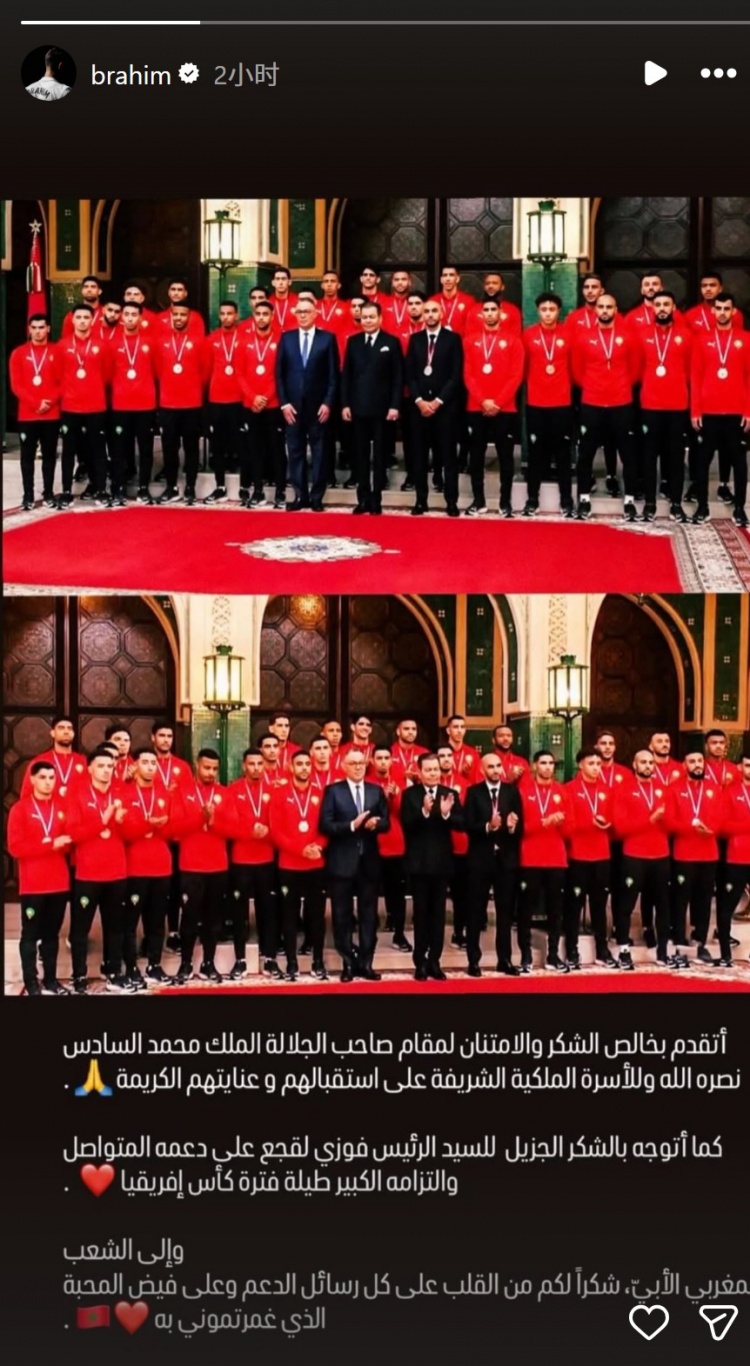 直播吧1月22日讯 摩洛哥在非洲杯中获得亚军,球队受到摩洛哥国王穆罕默德六世接见,迪亚斯社媒晒出照片,表示感谢。