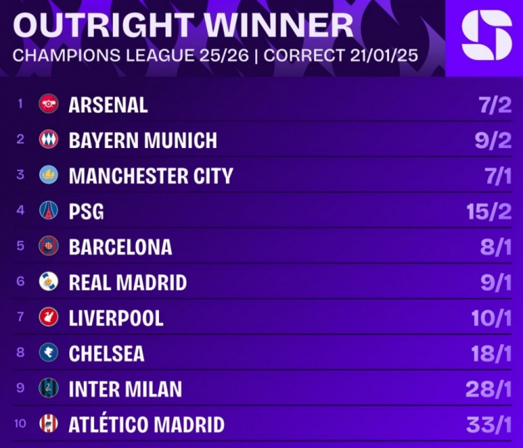 直播吧1月22日讯 欧冠联赛阶段第7轮比赛战罢,相关机构给出了欧冠夺冠的最新赔率,阿森纳居首,拜仁、曼城、巴黎前四。