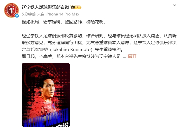 “经辽宁铁人足球俱乐部反复斟酌,综合研判,经与球员经纪团队深入沟通,认真听取多方意见,充分理解同行困扰,尤其尊重球员本人意愿,辽宁铁人足球俱乐部决定与邦本宜裕(Takahiro Kunimoto)先生重续签约。