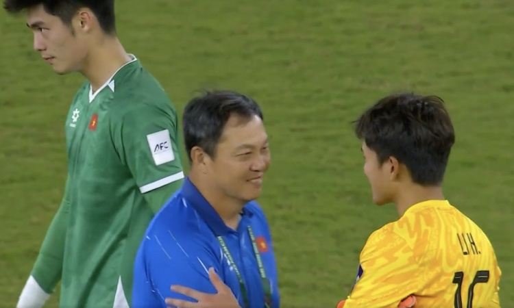 直播吧1月22日讯 中国U23男足半决赛击败越南U23,赛后李昊与对方门将拥抱致意。越南队门将教练李云在上前与李昊亲切交流,上演“宠溺”摸头杀。
