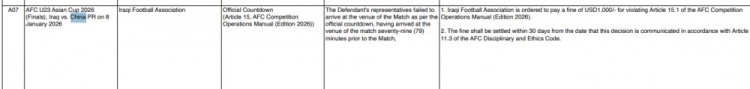 根据亚足联竞赛运营手册(2026年版)第15.1条之规定,伊拉克足协被罚款1000美元,罚款应自本决定送达之日起30日内支付。