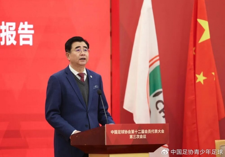 1月20日,中国足球协会主席宋凯在大会上作2025年中国足协工作报告。新华社记者 胡星宇 摄