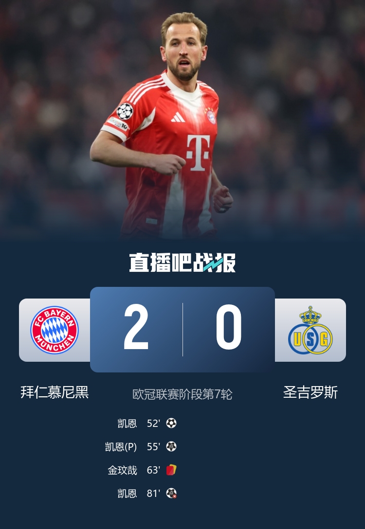 直播吧1月22日讯 北京时间4:00,欧冠联赛阶段第7轮拜仁慕尼黑vs圣吉罗斯,比赛在安联球场打响!上半场,金玟哉染黄,诺伊尔神扑救险。下半场,凯恩3分钟内破门+造点+点射完成梅开二度!金玟哉两黄变一红被罚下;奥利塞造点,凯恩第二次主罚点球,皮球击中门框!最终,十人拜仁2-0击败圣吉罗斯,提前一轮锁定前八,晋级欧冠16强!