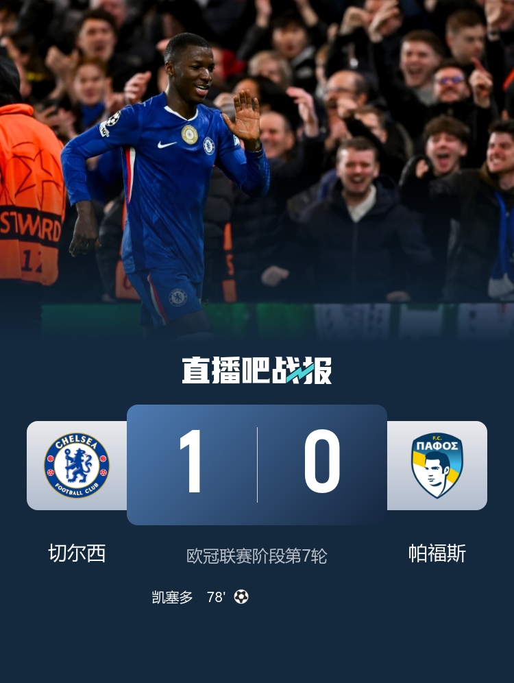直播吧1月22日讯 欧冠联赛阶段第7轮,切尔西坐镇主场斯坦福桥球场迎战帕福斯。上半场,恩佐头槌破门被吹,帕福斯折射中柱。易边再战,埃斯特旺造险,凯塞多破僵制胜。最终切尔西1-0帕福斯。积分榜方面,切尔西13分第八,帕福斯6分第30。