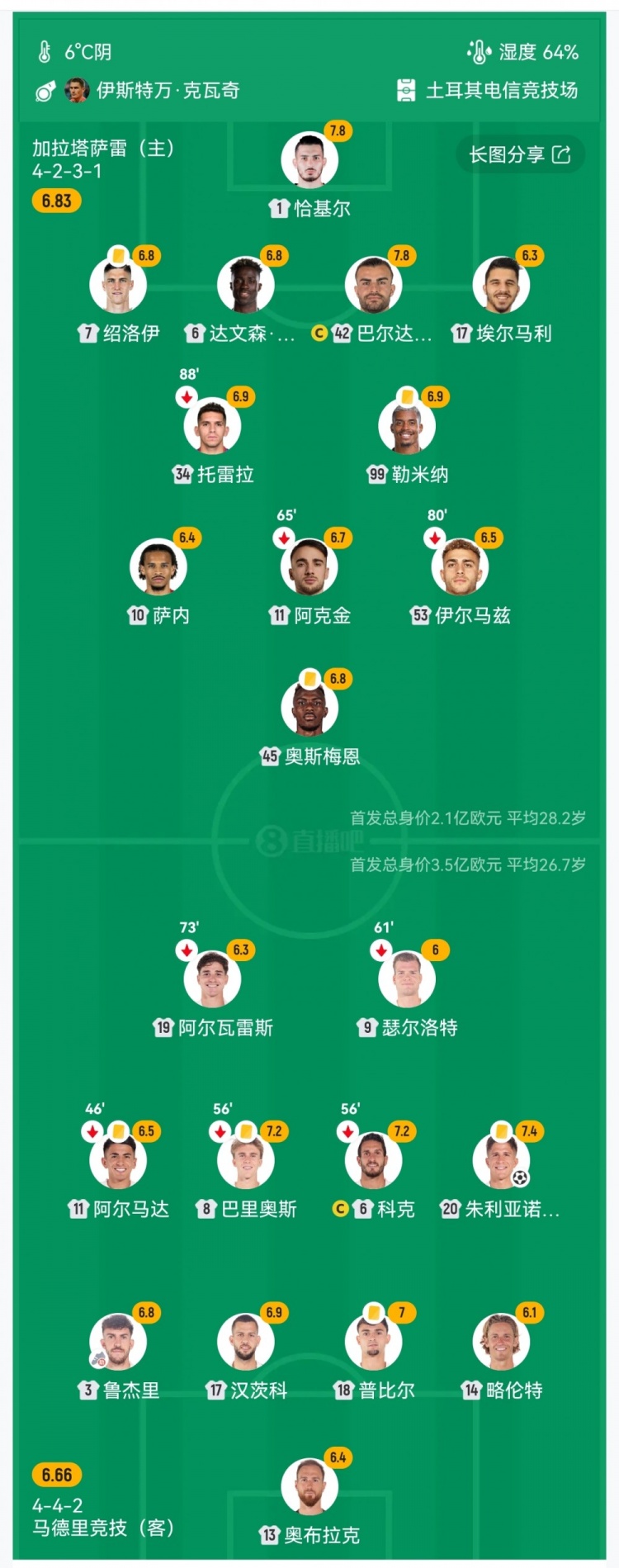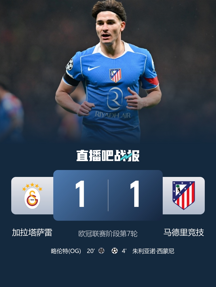 直播吧1月22日讯 欧冠联赛阶段第7轮,加拉塔萨雷坐镇主场土耳其电信竞技场迎战马德里竞技。上半场,小西蒙尼先拔头筹,略伦特自摆乌龙。易边再战,加拉塔萨雷关键门将解围,奥布拉克读秒神扑。最终加拉塔萨雷1-1马竞。积分榜方面,马竞13第八,加拉塔萨雷10分第十六。