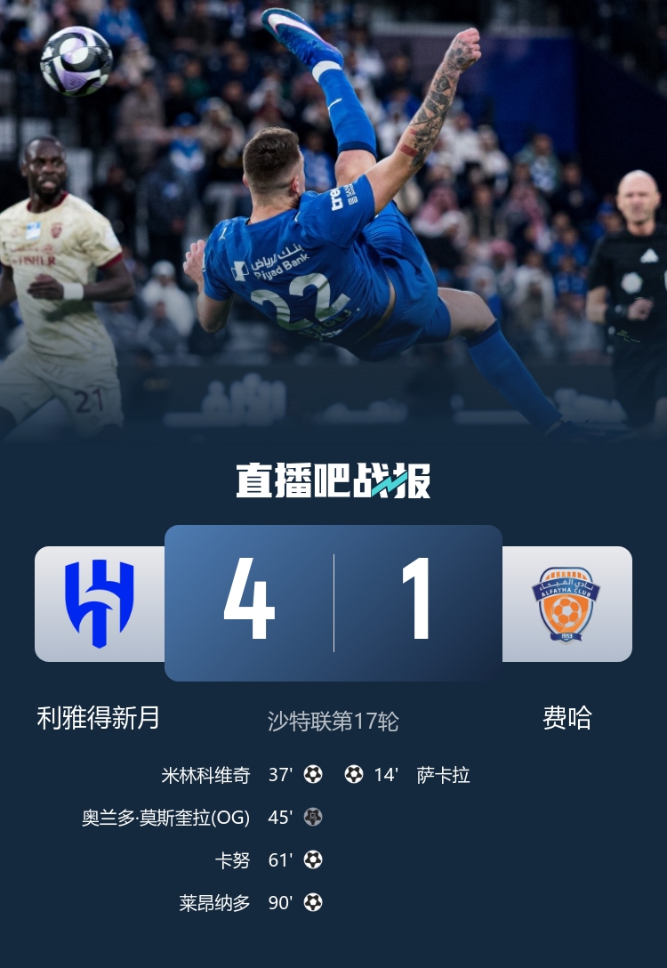 直播吧1月23日讯 北京时间1月23日凌晨1时30分,2025-26赛季沙特联第17轮在利雅得王国竞技场展开角逐,利雅得新月主场迎战费哈。上半场门将亚米出击送礼致丢球,米林科维奇倒钩扳平,内维斯角球造乌龙反超,下半场卡努扩大比分,莱昂纳多锁定胜局,内维斯两送助攻。最终利雅得新月主场4-1逆转费哈,新月豪取联赛13连胜,积44分继续领跑+领先第2名胜利7分。