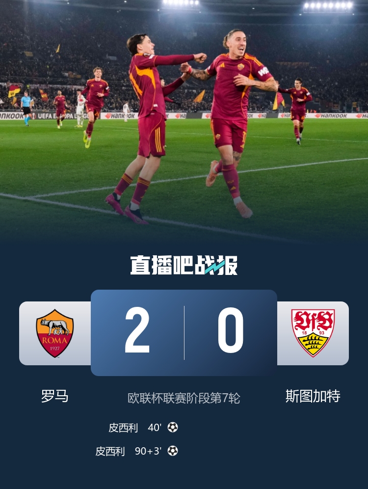 直播吧1月23日讯 欧联杯联赛阶段第7轮,罗马坐镇主场罗马奥林匹克球场迎战斯图加特。上半场,苏莱助攻皮西利首开纪录。易边再战,翁达夫、德米洛维奇失良机,皮西利补时再进一球。最终罗马2-0斯图加特。积分榜方面,罗马15分升至第六,斯图加特12分第12。