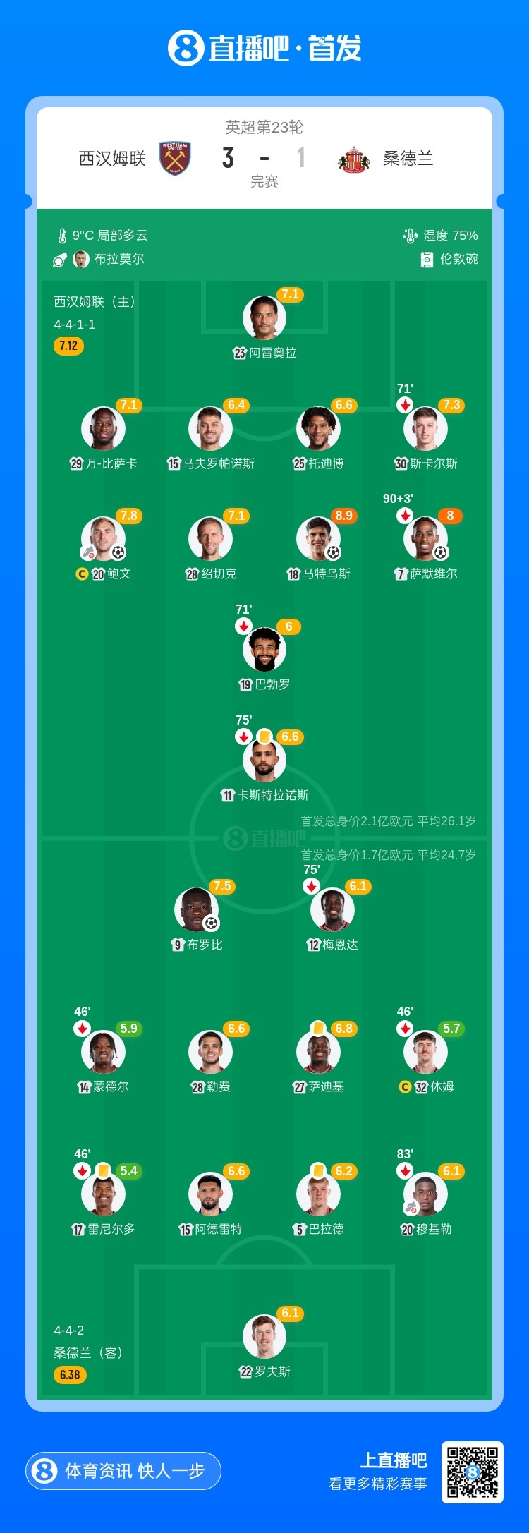 第43分钟,西汉姆联禁区内左侧射门被封堵,外围马特乌斯·费尔南德斯远射破门!西汉姆联3-0领先桑德兰↓