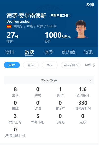 德罗·费尔南德斯现年18岁,2022年加入巴萨青训,目前身价1000万欧。本赛季他为巴萨一线队出场5次,并为巴萨竞技出场3次,欧冠比赛贡献1次助攻。