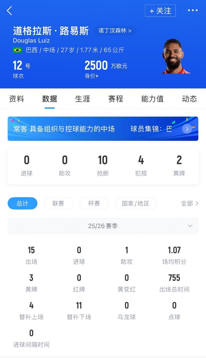 道格拉斯·路易斯现年27岁,巴西中场,维拉在2024年夏天以5150万欧元将其出售给尤文,球员在尤文总计出场27次,没有贡献进球与助攻。在去年夏天路易斯租借加盟森林,目前球员德转身价为2500万欧元。