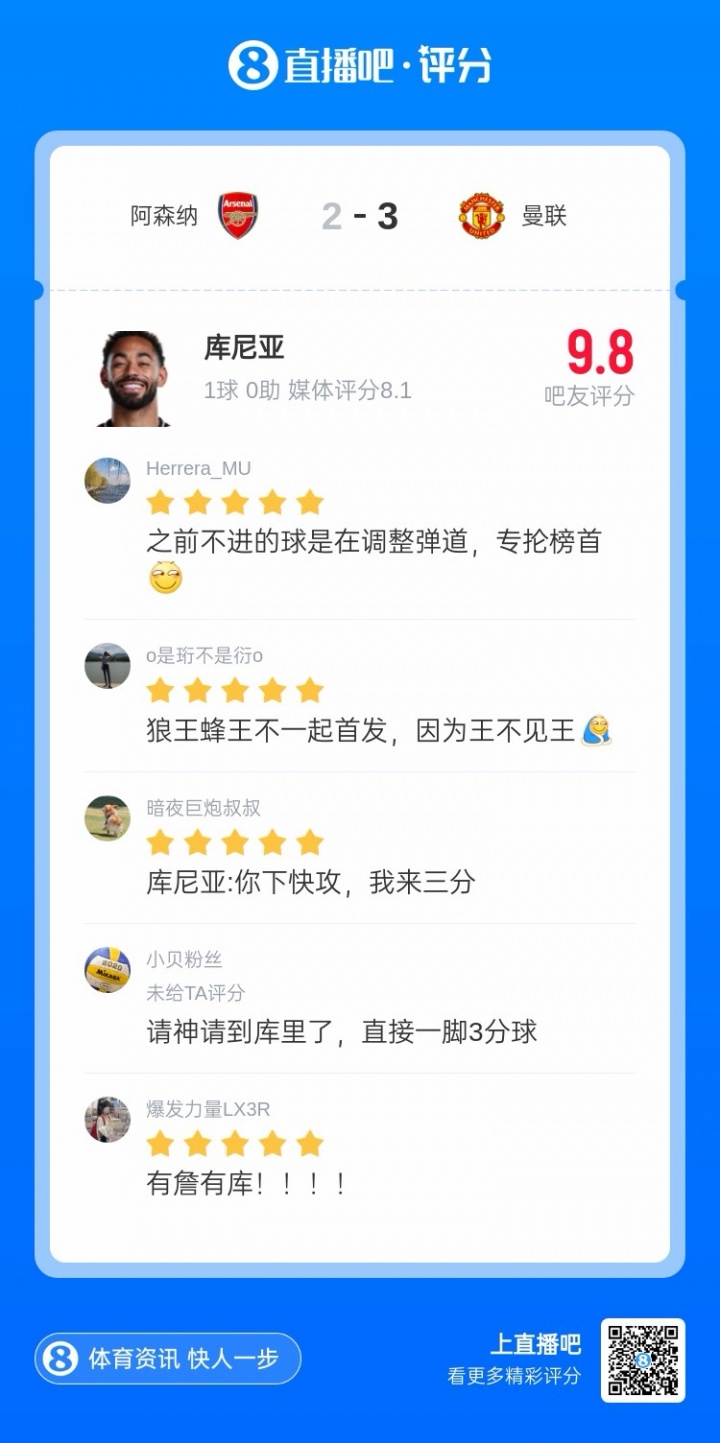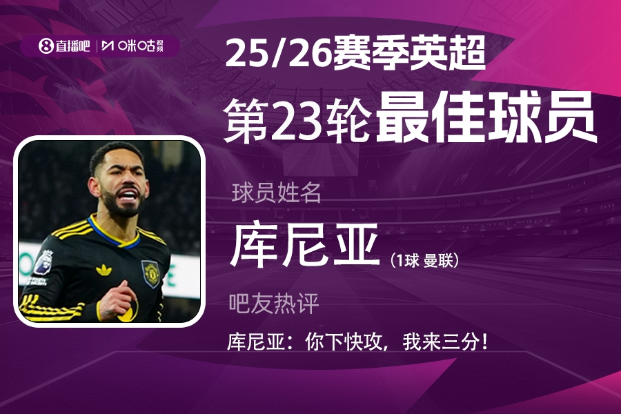 2025-2026赛季英超火热进行中,直播吧和咪咕体育联合发起每轮英超最佳球员评选活动!第23轮评选结果已经出炉,曼联前锋库尼亚当选!