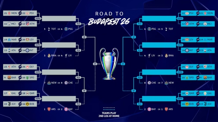 按照第7轮结束后的排名,欧冠淘汰赛对阵情况如下