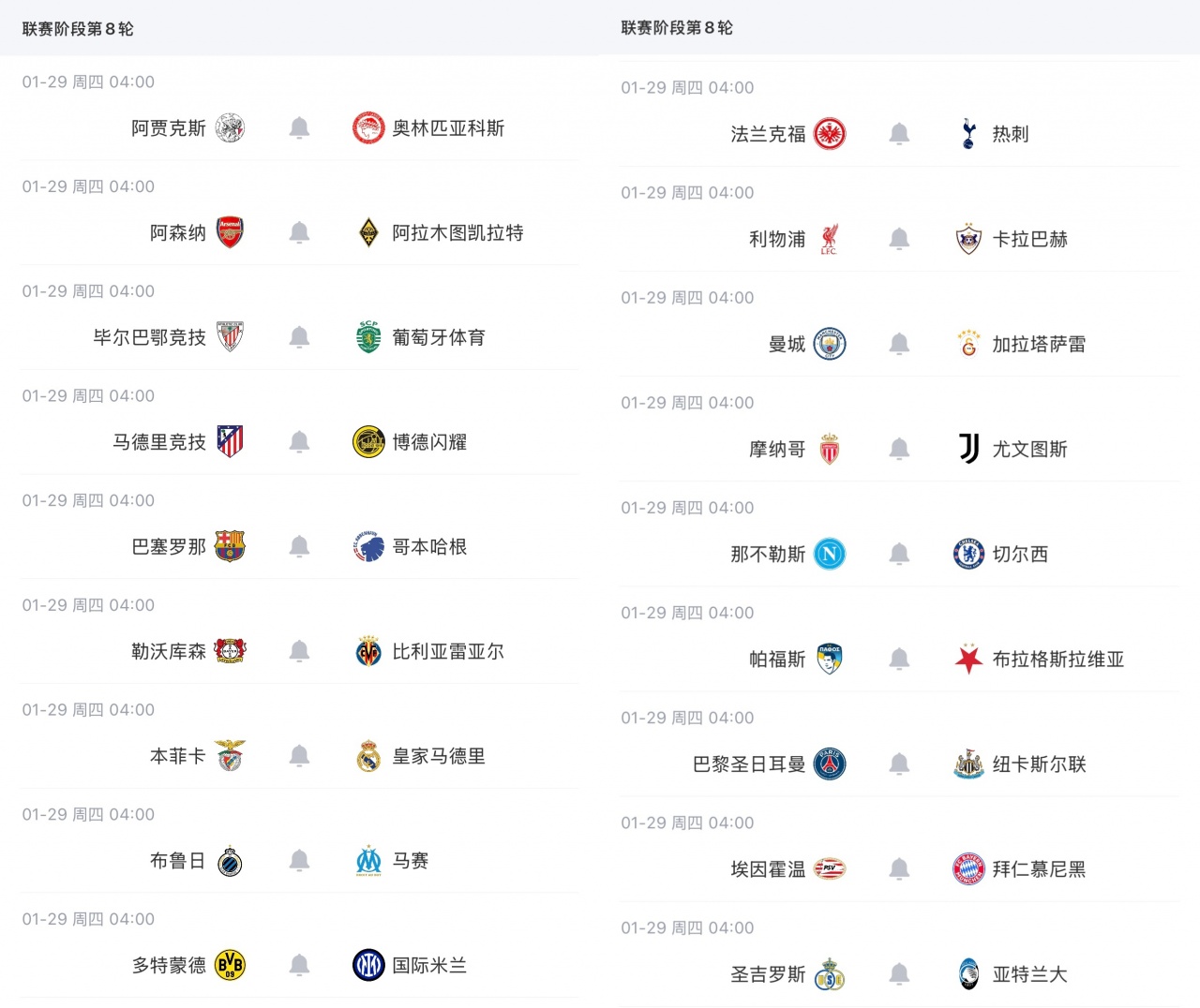 直播吧01月28日讯 明天凌晨4点,2025/26赛季欧冠小组赛第8轮18场比赛同时开球。